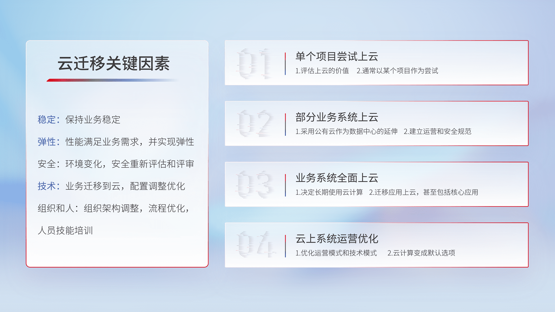 结合实际业务,,从规划设计、、云平台选型、、云原生改造、、、、数据迁移、、、、集成交付,,,迁移全过程为客户识别最佳上云路径,,做好风险识别管理,,,,设计网络架构、、、身份权限、、、、安全审计合规、、操作审计、、、日志审计、、、、监控告警策略、、多站点容灾设计等,,,,对云上基础设施进行整体规划,,提升IT治理水平,,以满足弹性、、高可用、、、高性能的需求。。。。